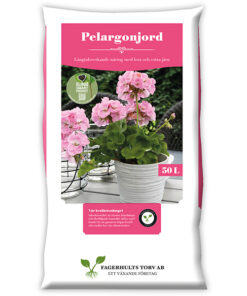 Används med fördel till alla slag pelargoner, t.ex. zonale, hortorum, rosenpelargon, Mårbacka och tulpanpelargoner. Tänk på att mer näringskrävande pelargonsorter ändå kan kräva ett näringstillskott under säsongen. Innehåller långtidsverkande näring samt extra järn. Strukturen är luftig samt innehåller lera (binder näring) och sand (som skapar struktur).